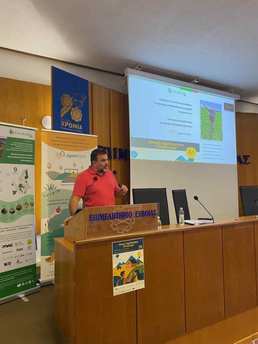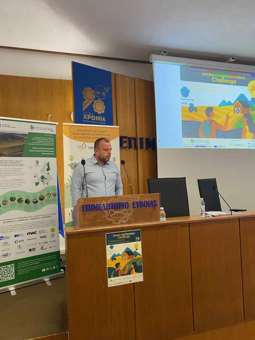 Πραγματοποιήθηκε με επιτυχία το διήμερο Υβριδικό Hackathon «Smart Agritourism Challenge», 27-28/09/2025, το οποίο υλοποιήθηκε από το δίκτυο Open Farm, στο πλαίσιο του ευρωπαϊκού έργου PoliRuralPlus, υπό την αιγίδα του Επιμελητηρίου Ευβοίας και της Περιφέρειας Στερεάς Ελλάδας. Χαιρετισμό κατά την έναρξη των εργασιών απηύθυνε το μέλος του Δ.Σ. και εκπρόσωπος του Επιμελητηρίου Εύβοιας στην Αγροδιατροφική Σύμπραξη Στερεάς Ελλάδας κ. Νικόλαος Κεντρής.
